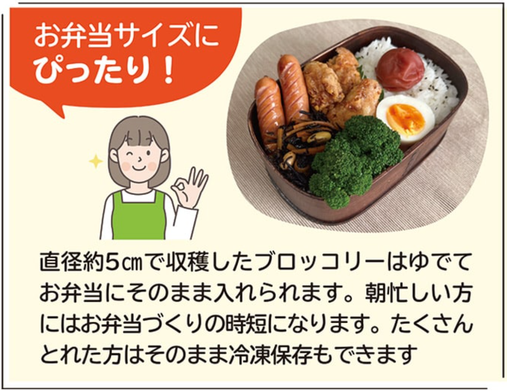 従来の側花蕾タイプとは違って、わき芽が次々に収穫できます。わき芽はお弁当サイズで収穫できるため、収穫したらそのまま調理にも使えます。そんな「よくばり®」の魅力をたくさんご紹介します。
