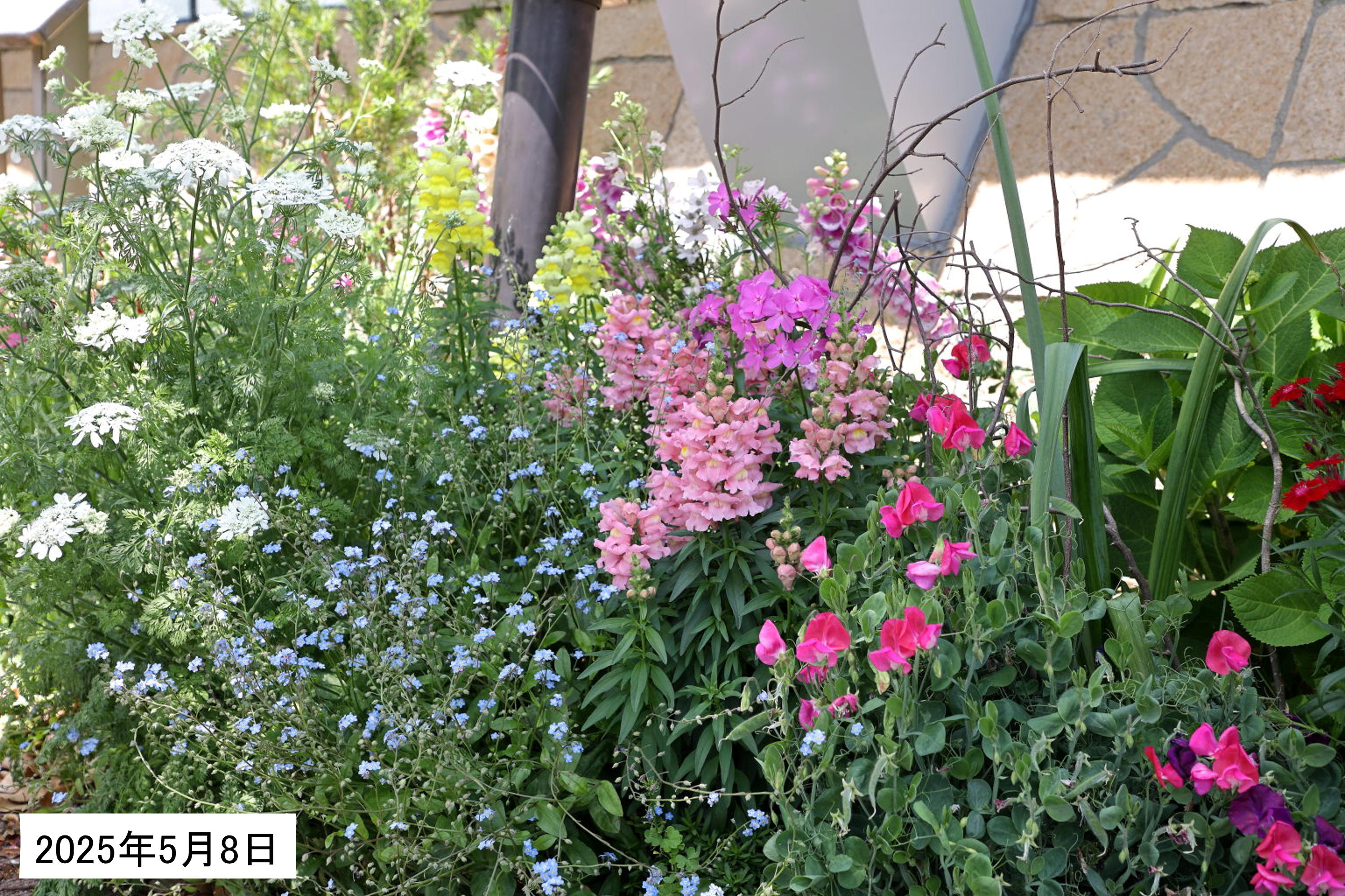 こぼれ種でできた庭のような自然な風景にしたいときは、葉の形状が異なるものや、草丈違いで配置をするとナチュラルな景色になりやすいです。新しい根が育ちやすいように、通気性のよい土に整えてから植え付けます。