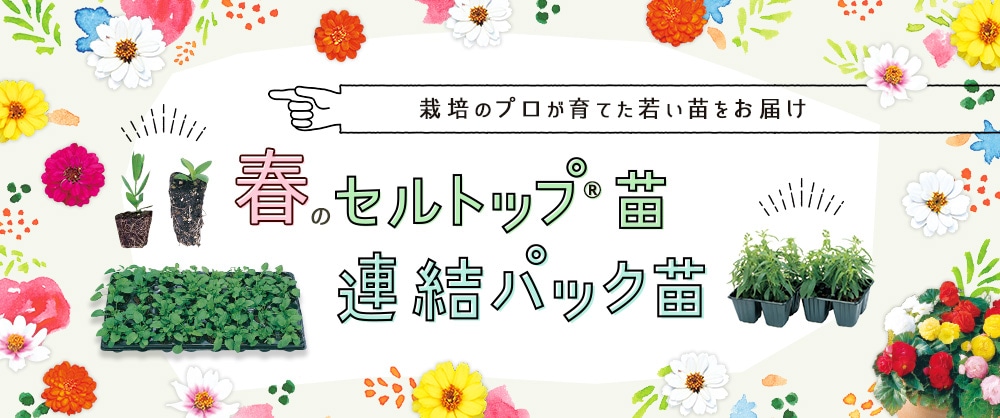 セルトップ(R)苗は32穴トレー、128穴トレーで栽培した若苗です。すでに花が咲いたポット苗より、植え付け適期の苗なのでグングン育ちます。育苗の段階から栽培を楽しみたい方にもおすすめです。連結パック苗はセルトップ(R)苗よりも大きな若苗で、少量多品種植えたい方におすすめです。いずれも暑さに強い品種をラインアップしています。