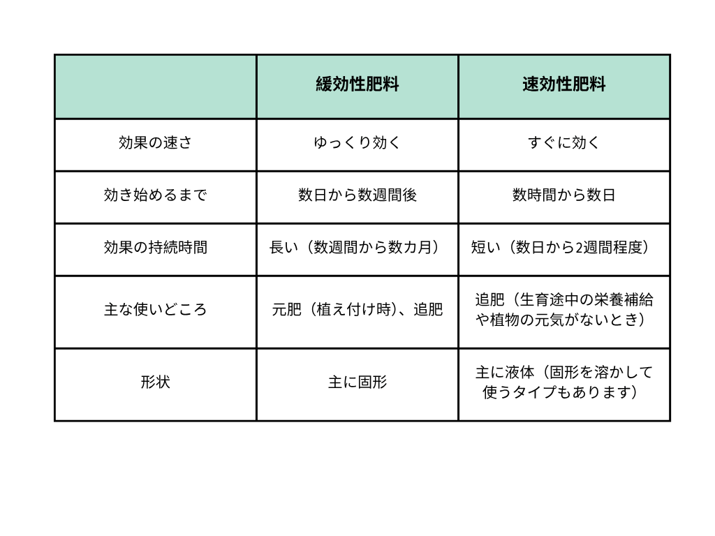 緩効性肥料は、「かんこうせいひりょう」と読みます。植物の元気がないときなどに即効性のある液体肥料とは異なり、緩効性肥料は、肥料成分がゆっくりと長い期間にわたり溶け出し、効果が長く続く肥料のことです。固形肥料がこれに当たります。