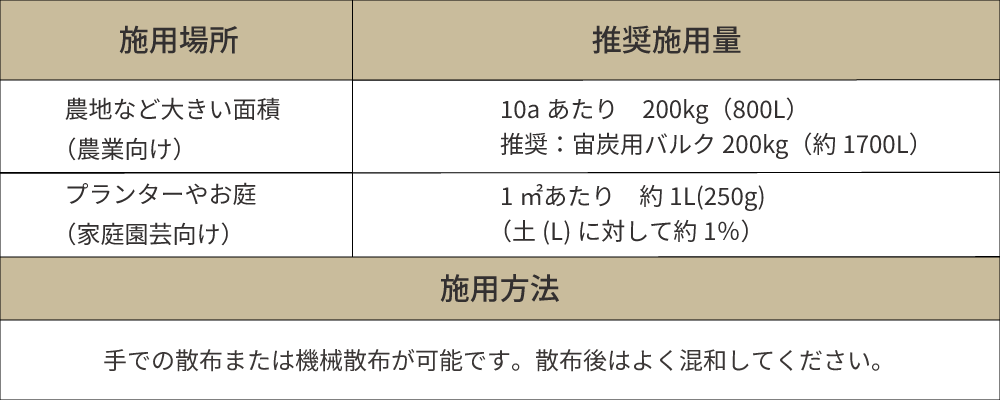 A. 1㎡あたり約1L(250g、土の容量Lに対して約1%)が目安です。堆肥や有機質肥料と一緒に混和してください。播種・定植の約4週間前に施用するのが理想です。