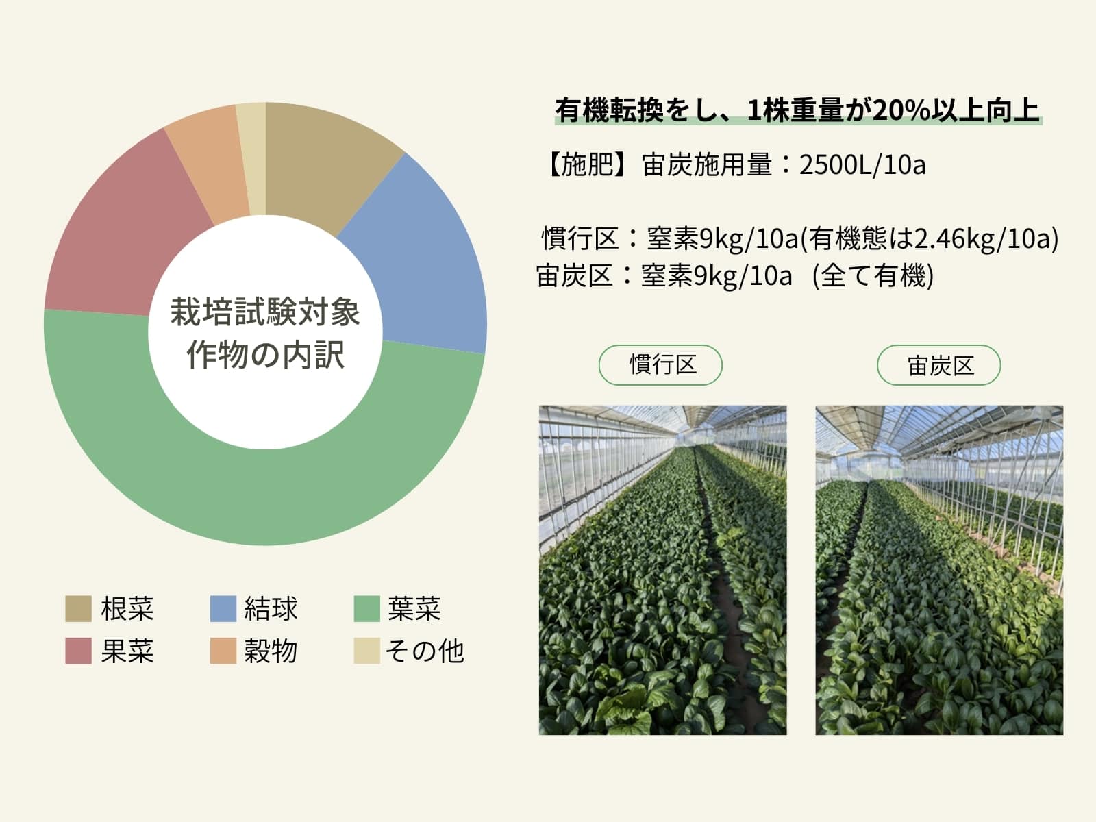 その結果、一般的に3〜5年かかると言われる土づくりを最短1カ月に短縮したり、有機質肥料の“効き”を高めたり、作物の収穫量や品質を向上させたりと、よい効果を生み出します。