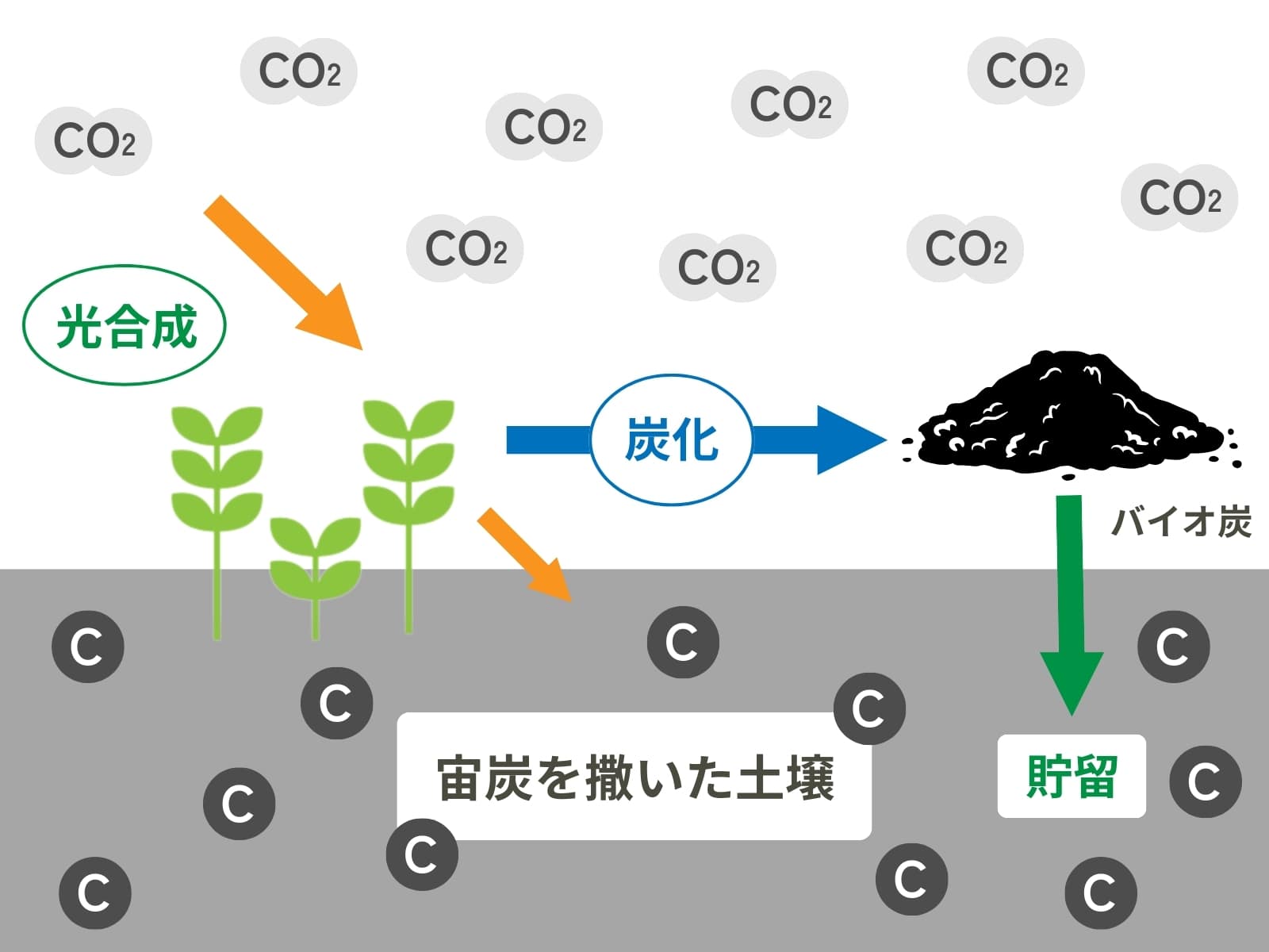 「宙炭(そらたん)」を農地に施用すると、土の中に炭素を長期間固定することが可能になります。「宙炭(そらたん)」の原料になるバイオ炭の生産時に、CO2排出量が少ない手法を取り入れることによって、貯留量が排出量を上回り、大気中のCO2を削減することもできます。