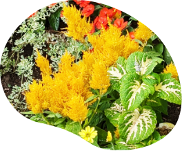 ケイトウ フランマ ゴールデン、ジニア プロフュージョン レモン/オレンジ、コリウス ハイウェイ ホワイト、サンパティオ® オレンジ、オステオスペルマム