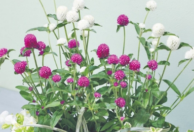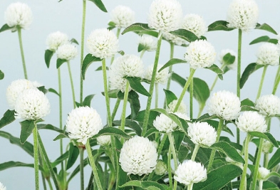 センニチコウ「ミラーボール」の組み合わせ花壇の写真。植栽されている草花:センニチコウ ミラーボール ホワイト、ジニア プロフュージョン ホワイト、ペンタス グラフィティー ホワイト