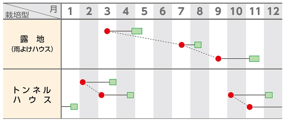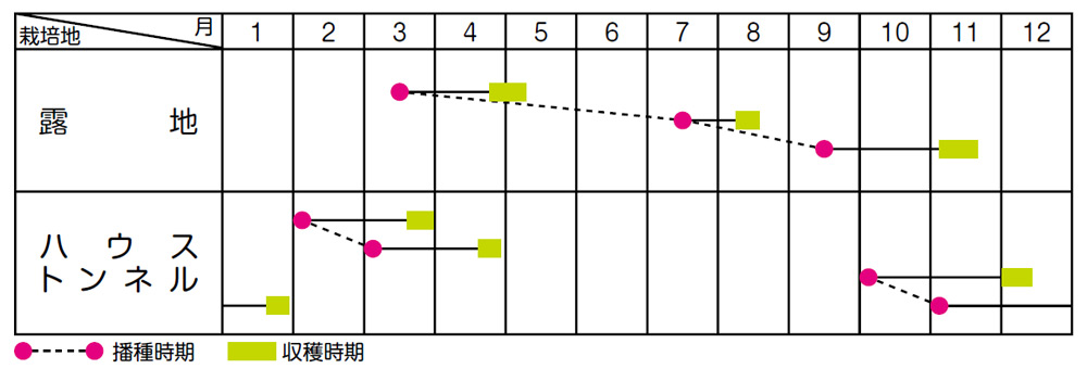 中晩生種で生育はゆっくりです。耐暑性、耐寒性に優れ周年栽培が可能で、特に高温期に能力を発揮します。