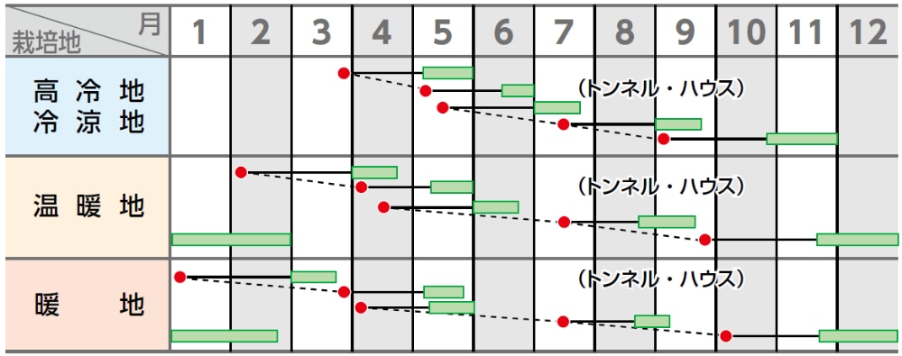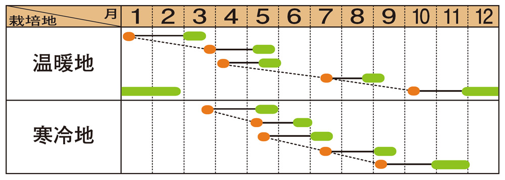晩抽性で、品質のよい大型の多収品種。周年栽培が可能です。高温期はやや立性で、寒さに当たるほど伏型になります。