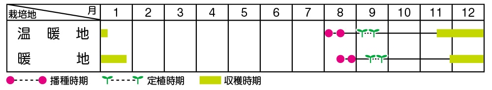 タネまき後115日前後で収穫できる中生種。根こぶ病に耐性を持ちます。花蕾は小粒でしまりがよく、濃緑色で凸凹の少ないきれいなドーム形になります。