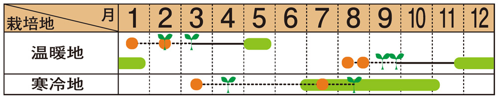 草姿は立性で、低温時のアントシアンの発生がなく、茎の空洞症が少ないです。タネまき時期・収穫期間の幅が広く、作りやすい品種です。