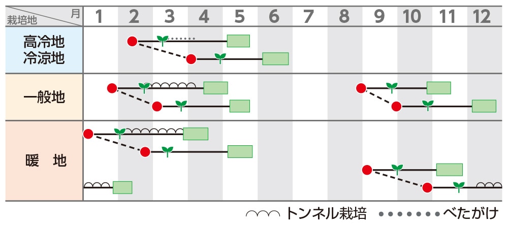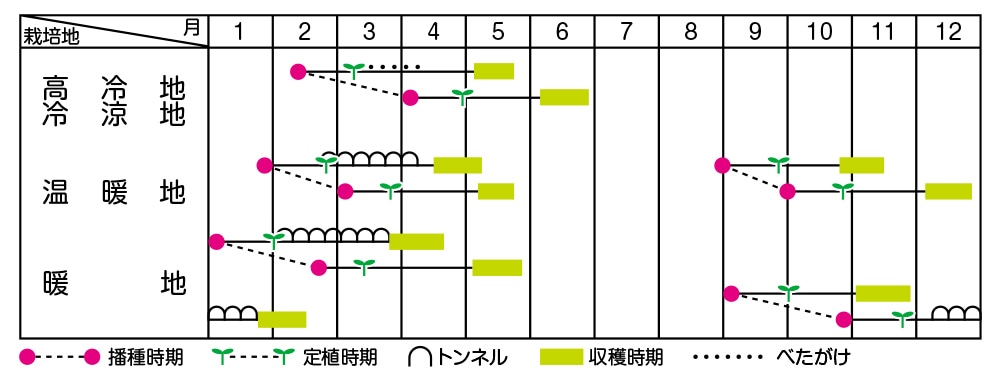 春の上昇気温にも赤色の発現がよい、遅抽だい系早生種です。葉は濃赤色で、葉肉厚くボリューム感があるので荷姿がよく、日持ちもよいです。草勢強く、株張り旺盛で低温伸長性に優れ、栽培も容易です。