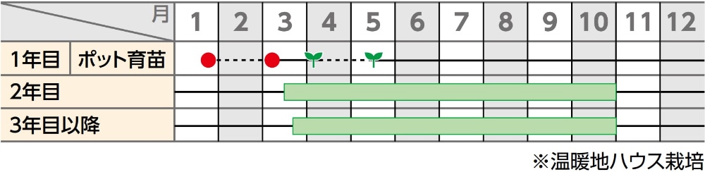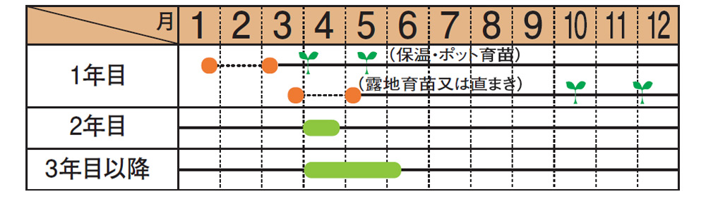 栽培のコツアスパラガスは、まず株を育てるのが大切。1年目は収穫せず、2年目も控えめに収穫。こうして我慢することで3年目以降はたくさん収穫できます。