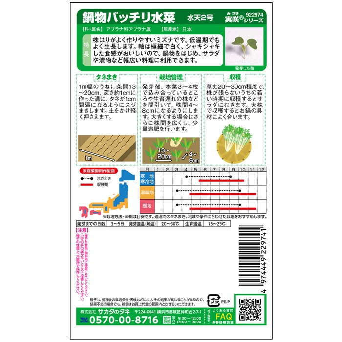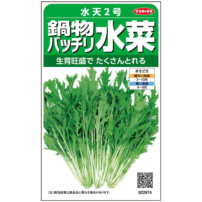 株張りがよく作りやすいミズナです。低温期でもよく成長します。軸は極細で白く、シャキシャキした食感がおいしいです。