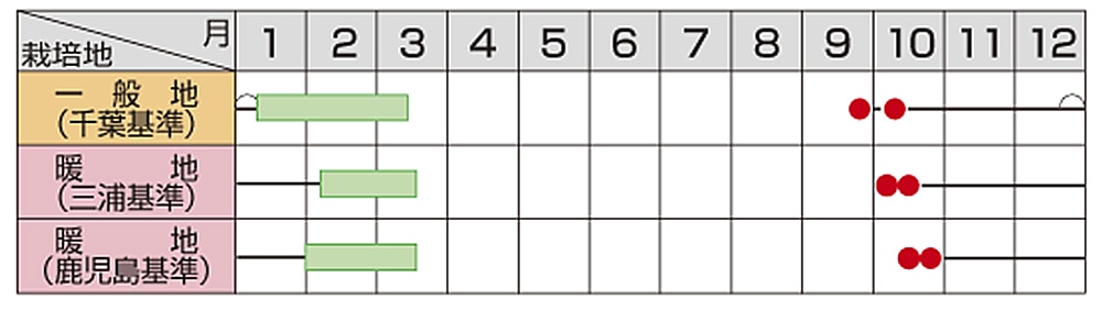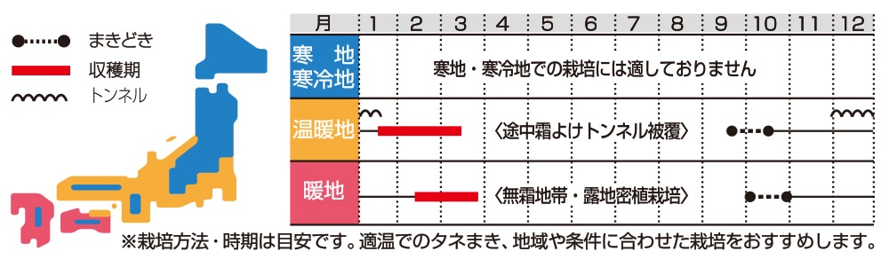 晩抽系の青首ダイコンであり、品質、外観とも秋系大根に近く、す入りも遅いです。3月下旬くらいまでは抽だいの心配なく収穫できます。やや黒葉のつまり葉、特に耐寒性が強く、暖地無霜地帯での密植型露地越冬栽培および温暖地の霜よけトンネル栽培に最適です。根部は根長37㎝、根径7㎝で肌にテリがあり、尻部の肉付きがよいです。首部内部の青肉になりにくいです。