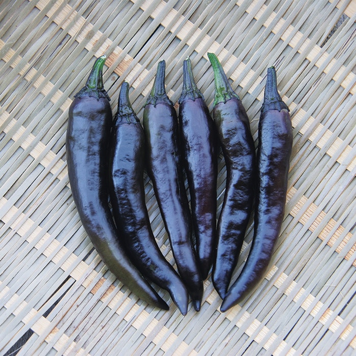 奈良県の伝統野菜。紫のツヤのある果皮でプランターでも栽培可能です。辛みはなく、完熟すると赤くなり、ほんのり甘みが感じられます。熱を加えると緑色に変色します。