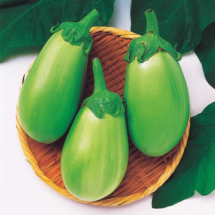 暑さに強く生育が旺盛です。葉が大きく果実はツヤのある淡緑色が特徴的です。果皮はやや硬いが果肉が柔らかく、焼きナスや煮物に向きます。