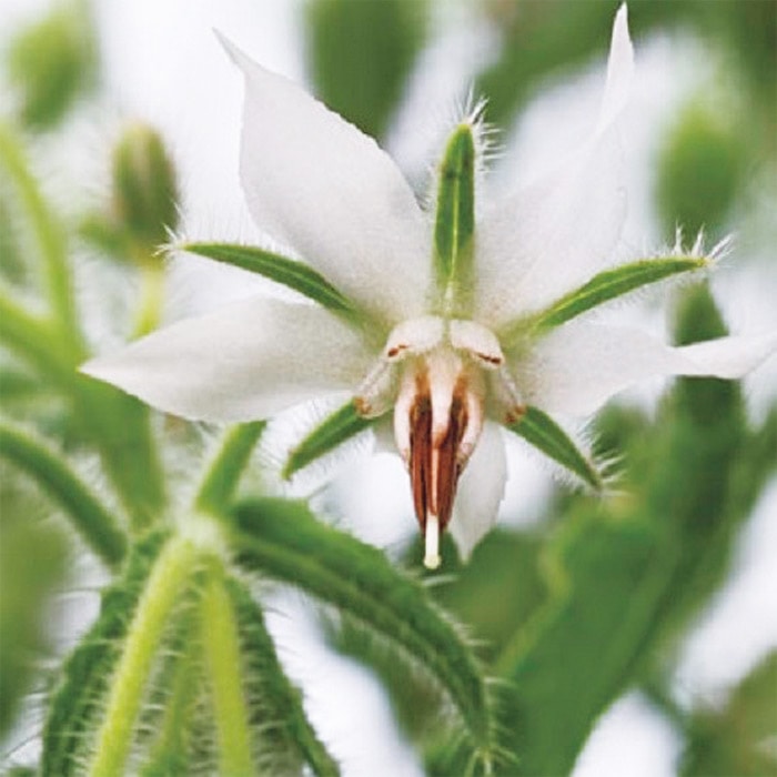 房なりの白い花は綺麗な星形でガーデンで観賞用としても楽しめ、大変育てやすいハーブです。白い柔毛を生やした葉はキュウリのような香りがあり、刻んでサラダに入れたりスープに入れるとおいしくいただけます。