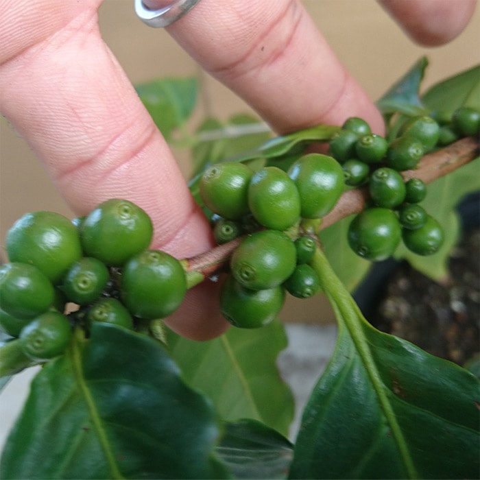 多く普及されているアラビカ種で、「ブルーマウンテン」、「モカ」、「キリマンジャロ」のような代表的な銘柄にも使われています。わい性種で管理がしやすく、実ができるまではグリーンリーフとして楽しめます。