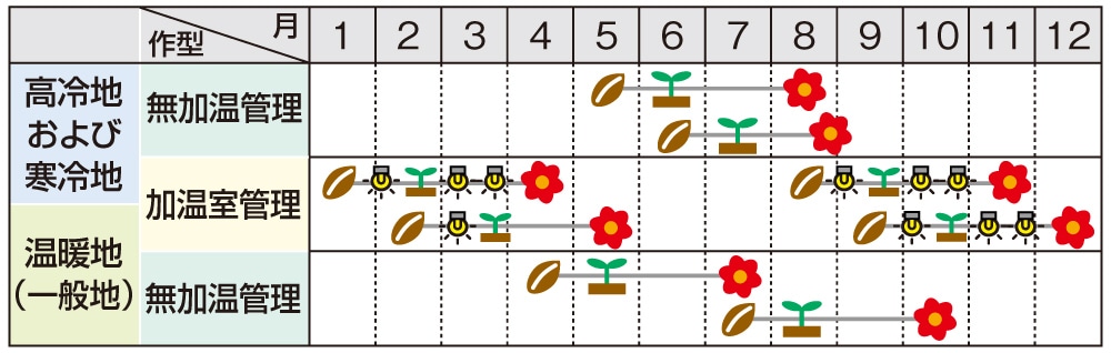 花穂が特に大きく、花壇、切り花に向いており、切り花栽培では密植による1本切りが有利。冬季は加温室内での電照栽培で、高品質な採花が可能です。高温期の開花はカリウムを効かせての栽培がポイントです。