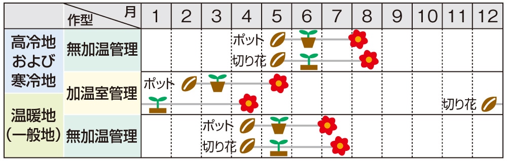 小葉で茎の硬い中高性品種。他のシリーズよりも高温多湿に強く、夏から秋の商材に適します。切り花、ドライフラワー、鉢物、ポット苗栽培に向きます。葉色が濃く、花とのコントラストがよいです。