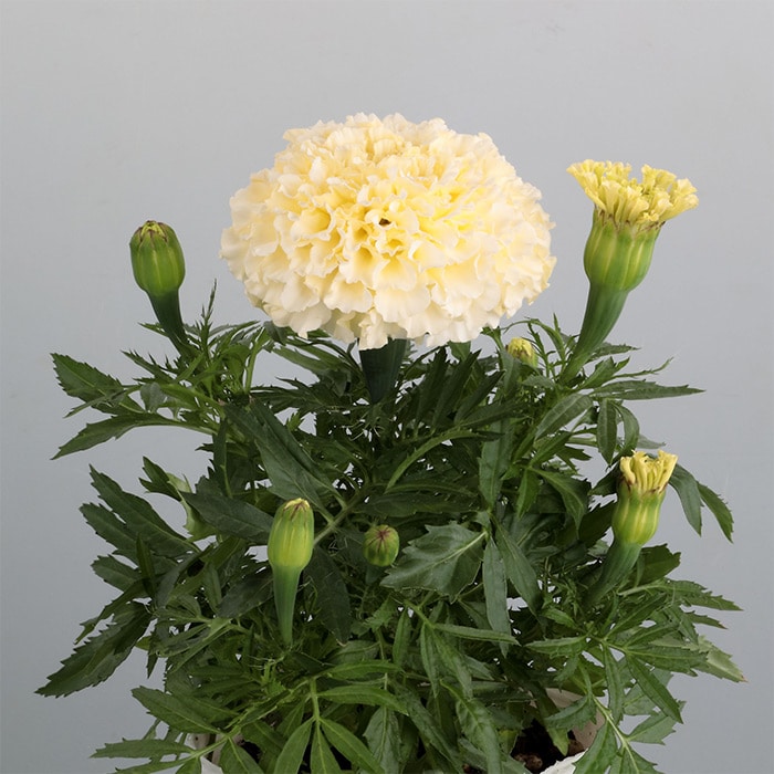 優しい乳白色で涼しげな印象を与えます。咲き始めは黄色みがかりますが、徐々に白くなります。暑さにも強く、長期間花を楽しめるわい性の品種です。