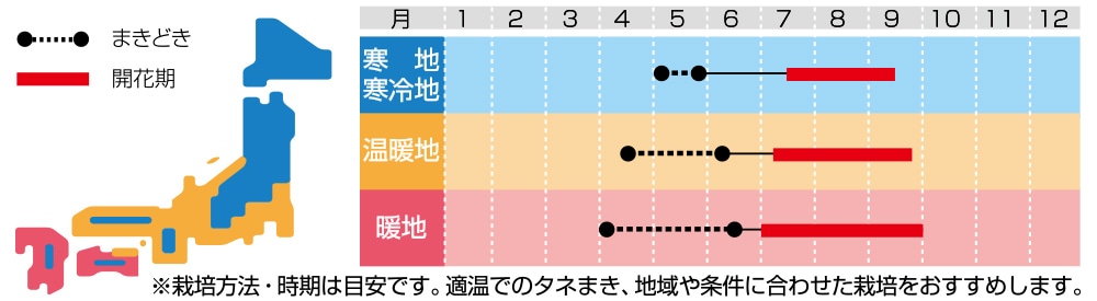 生育が非常に早く、発芽から開花、タネができるまでを見られるため、小学生の観察日記でも定番の植物です。実が熟すと軽く触れただけで莢がはじけタネを飛ばします。乾燥や暑さに強く、鮮やかな色彩の混合です。