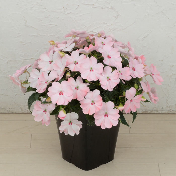 ・「サンパチェンス」の姉妹シリーズです。8号鉢で植えた場合、従来の「サンパチェンス」が1株で草丈約50cmに成長するのに対し、「サンパティオ」は小ぶりで、約30cmとよりコンパクトな草姿になります。