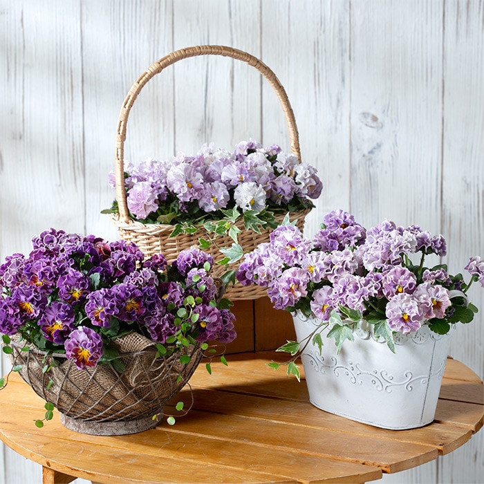 フリンジの繊細さや、色のグラデーションが醸し出す雰囲気は「ポンゼヴェールCOCO」ならではです。花付きもよく、すてきな空間を演出してくれます。花にフリンジのあるビオラは、花首が上に伸びることが多いですが、「ポンゼヴェールCOCO」は、花首が短く、株全体も立ち上がらないため、まとまりのよい花束のような株姿に仕上がります。