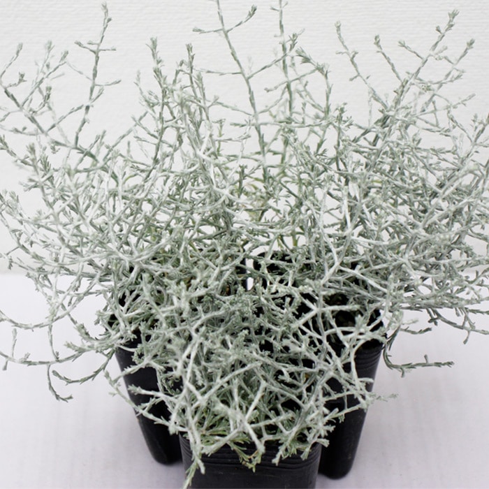 銀色の細かい小枝が密集する美しい常緑小低木です。春から夏にかけて白色の花弁と黄色の雄しべの小さな球形の花を咲かせます。耐寒性はやや強く、乾燥に強いですが、高温多湿を嫌います。寄せ植えや庭のアクセントとして最適で、手入れが簡単です。庭やコンテナに美しいアクセントにもなります。別名はクッションブッシュ。