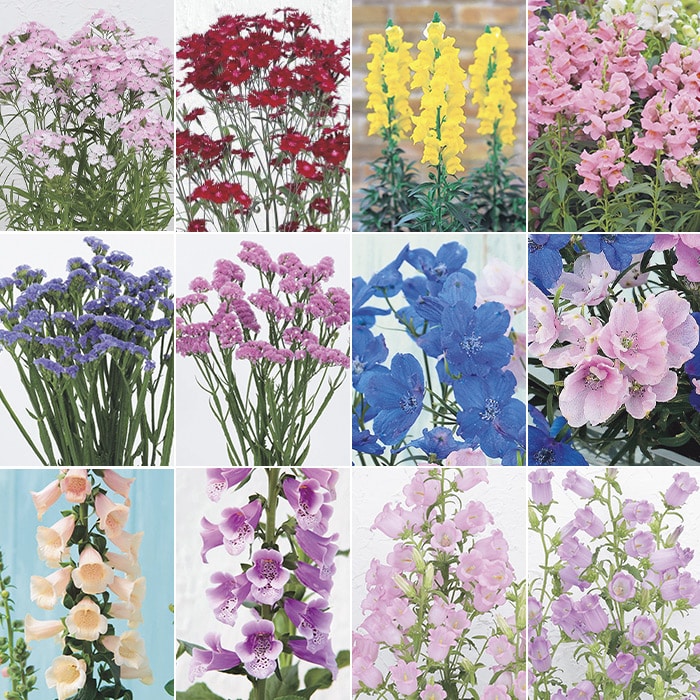 - 【スターチス】ディープローズ、スカイブルー、【キンギョソウ ソネット】ピンク、イエロー、【ダイアンサス】レッド、マジカルピンク、【カンパニュラ チャンピオンiQ】ライラック、ピンク、【ジギタリス】パープル、アプリコット、【デルフィニウム プデル】シェルピンク、ブルー