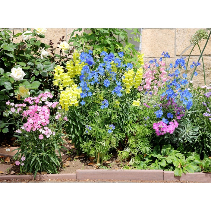 デルフィニウム プデル シェルピンクとブルーを主役にした春待ち苗のセットです。パステルカラーの花色でやわらかな印象の花壇になります。鉢植えで組み合わせても楽しめます。