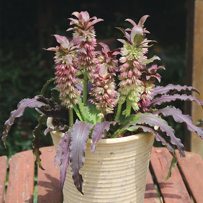 チョコレート色の黒に始まり紫に発色する葉とバイカラーの花が印象的な小型種。