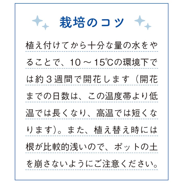 ※開花時期は、地域、栽培環境の気温によって異なる場合があります。