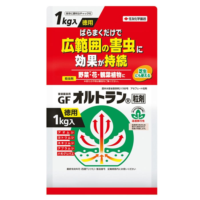 吸汁性害虫(アブラムシ等)および食害性害虫(ヨトウムシ、アオムシ等)に効果のある浸透移行性殺虫剤です。効果が持続しますので、広範囲の園芸害虫の防除に適しています。