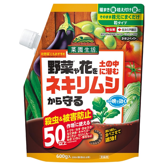 株元にばらまくだけで土の中に潜むネキリムシを誘い出し、食べさせて退治します。効果は速効性で、植え付け後や発芽後の作物を害虫から守るので、被害防止に有効です。