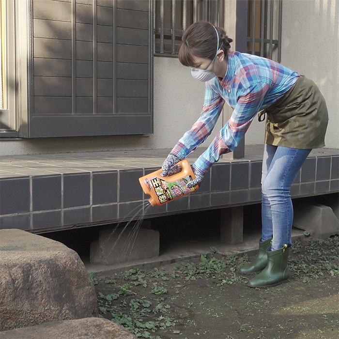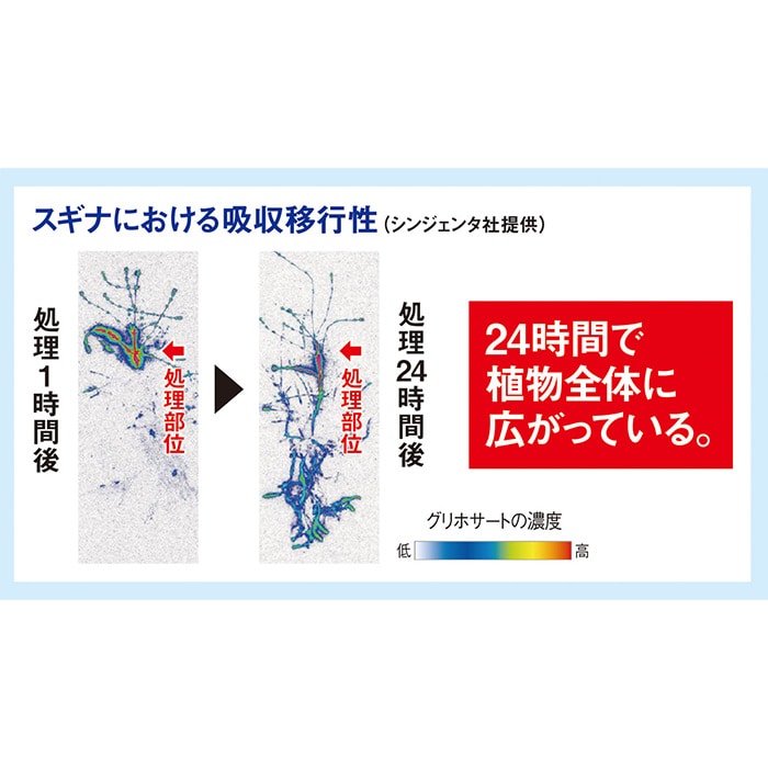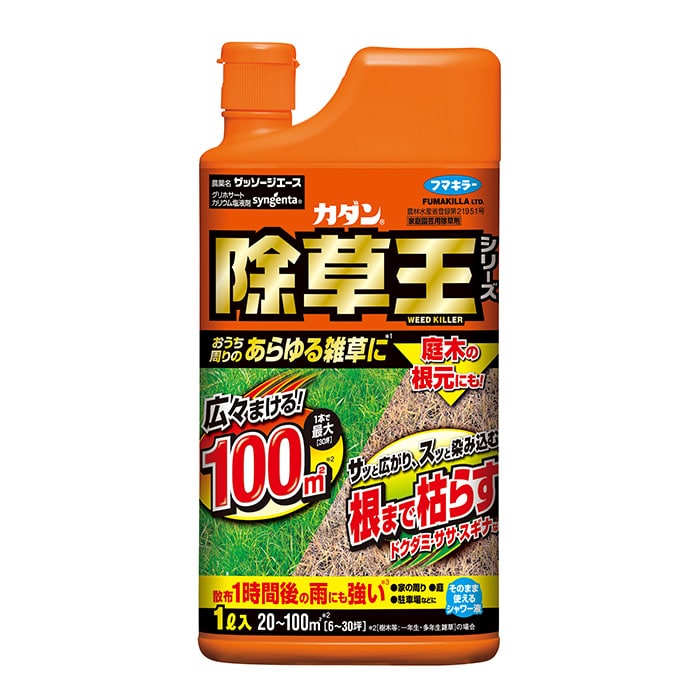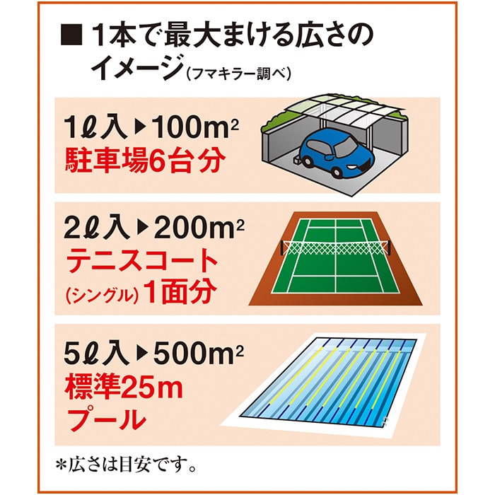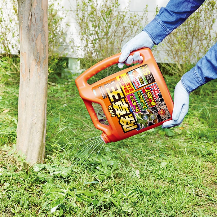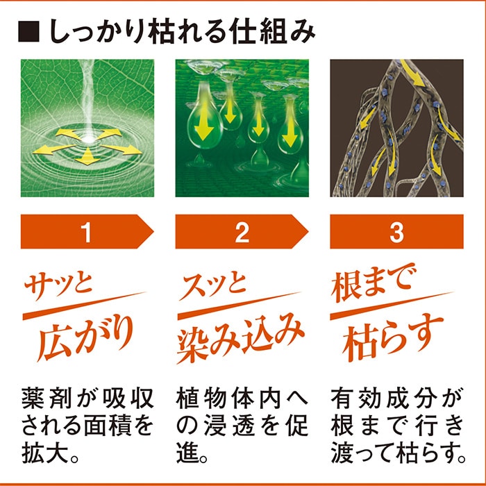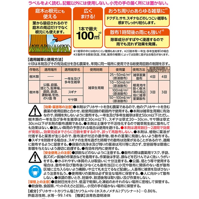 独自処方で雑草への拡展性と浸透性を高めた最新※1の除草成分〈グリホサートカリウム塩〉が、雑草の葉茎表面にサッと広がりしっかり付着、根まで浸透してしっかり枯らします。除草成分が素早く浸透するので、散布後1時間の雨でも流れてしまうことなく安定した効果を発揮します※2。薬剤は土壌に落ちると速やかに吸着・不活性化され、土壌微生物によって分解されるので、庭木の根元に生えた雑草にも使えます。1L当たりで最大100㎡まけます※3。※1 グリホサートカリウム塩として※2 散布する環境(気温・天候・雑草の種類)によって効果に差が出る場合があります。※3 [樹木等:一年生・多年生雑草]の場合