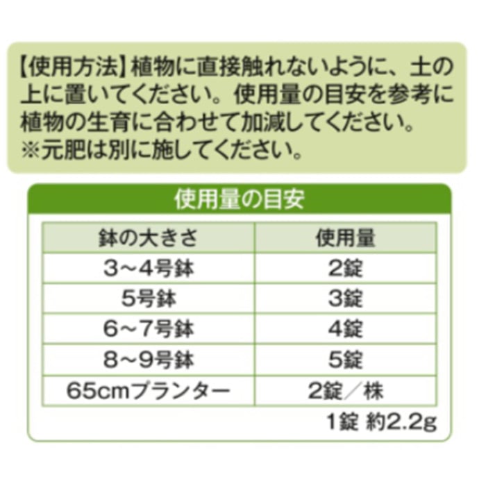 株元に置くだけで、水やりのたびに少しずつ肥料成分が溶けだしてゆっくり効果を発揮。約2~3カ月効果が持続します。