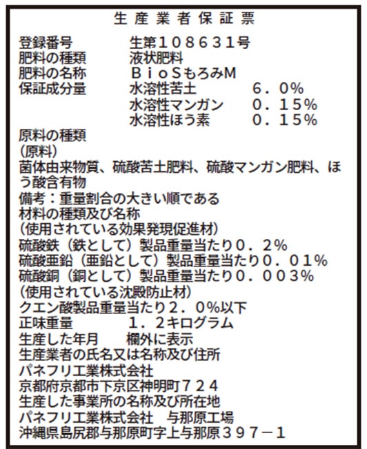 微量要素(ミネラル)をバランスよく配合しています。琉球泡盛黒麹菌と酵母菌が産生する天然のクエン酸とアミノ酸に微量要素(ミネラル)をバランスよく配合しています。作物がストレスを感じやすい時期、品質や樹勢の維持に役立ちます。