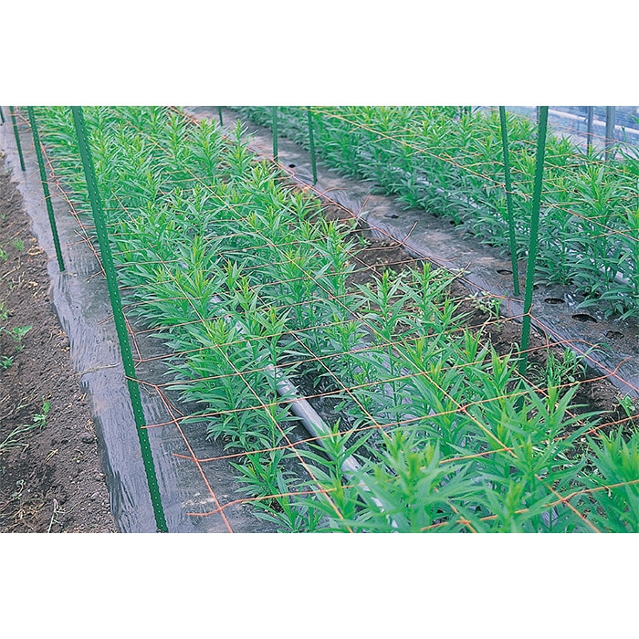 フラワーネットとは主に花などの茎が上に向かって立ち上がる植物の倒伏防止に用いるもので、品質の高いまっすぐな茎の育成や、倒伏防止に大変効果的です。また、トウモロコシ、ピーマン、ナス、トウガラシも、育成時に幹をまっすぐ立てることで世話がしやすくなります。高密度ポリエチレンを使用しており、高耐久で長時間の使用にも耐えられます。また、網糸がなめらかで茎や花を傷めません。対象作物(例)
