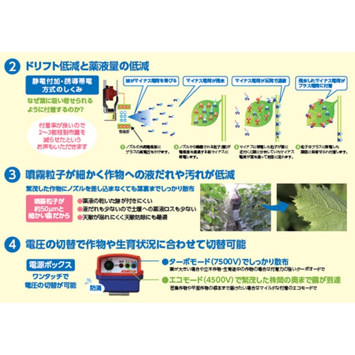 ④電圧の切り替えで作物や生育状況に合わせて切り替え可能(ターボモード7500Vでしっかり散布)(エコモード4500Vで繁茂した株間の奥まで霧が到達)