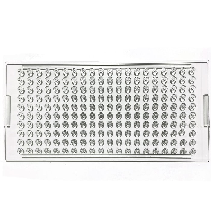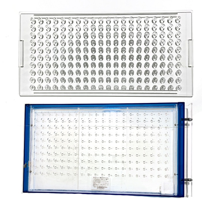 【アクリルプレス】ペレット種子をプラグトレーの中心にまきやすくします。