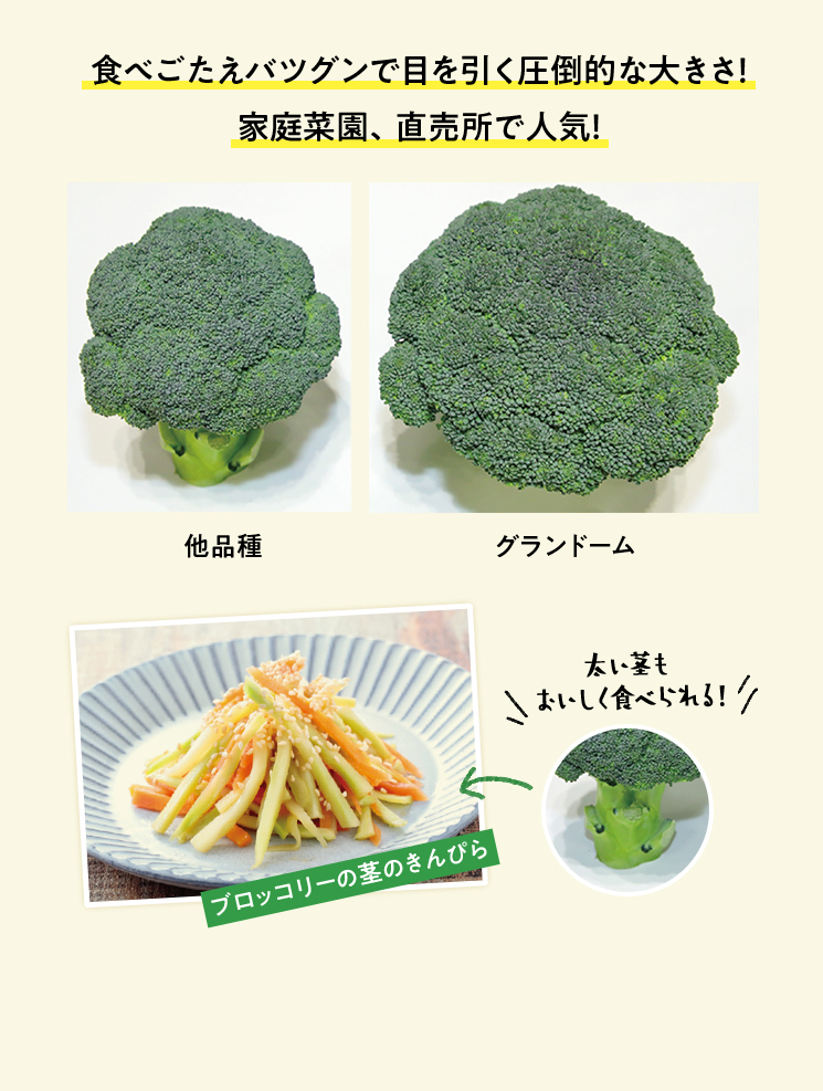 生育が旺盛で、プロにも負けない大きく立派なドーム型のブロッコリーが収穫できます。根が強いため、水はけが悪い畑でも安心して栽培できます。また、大きく肥大しても、くずれにくい安定した品質も魅力です。