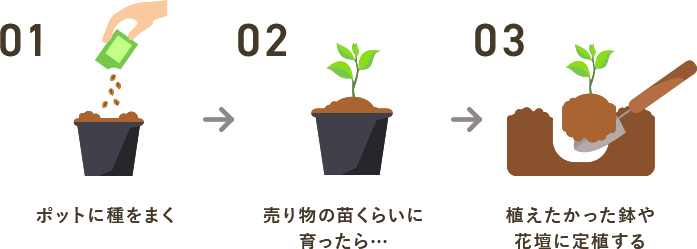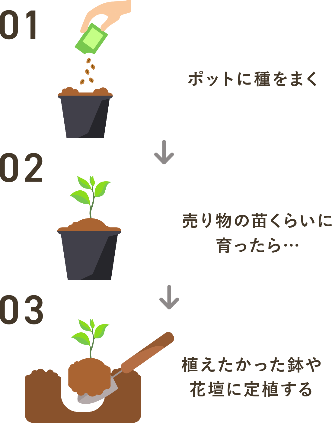 ※きれいにしっかり育てたい場合は、土を耕す→土を平らにする→種をばらまく→土をかける→水をやるというステップをやるとよりよいです。