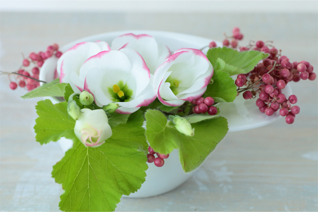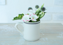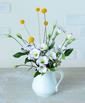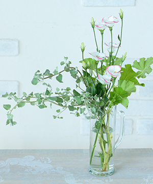 少し深めで安定感のある器に入れると蕾の動きを楽しめるアレンジになります。
