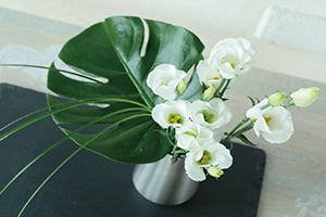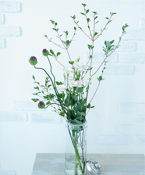 スタイリッシュな雰囲気を生かせるようスリムな器に。風が通り抜けそうな涼やかなアレンジになります。
