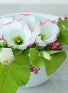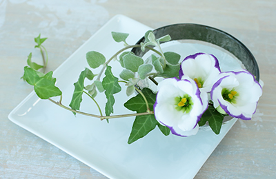 短い枝はボウルに浮かべるようにアレンジ。水面を見せて生けるとワンランク上の魅せ方ができます。