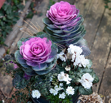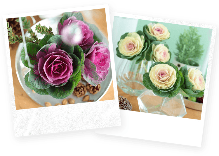 クリスマス飾りにおすすめ。9月中旬に種をまいて、クリスマスにはハボタンのリースが完成!(写真左) その後も色の変化を楽しめます。2月上旬にヒヤシンスと撮影。(写真右) ハボタンのリースの