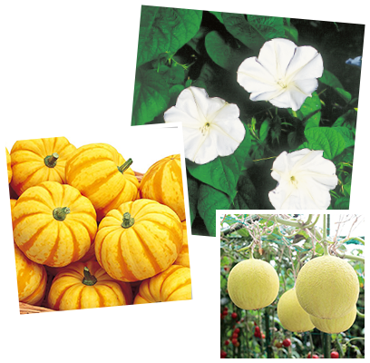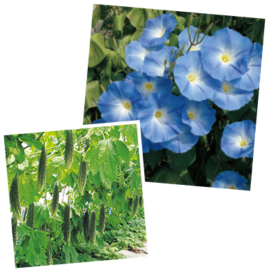 たわわに実るミニメロンやミニカボチャ、夜に咲き香りもすてきな白花ユウガオ、つるの伸びが旺盛で涼しげなブルーの大輪花を咲かせるベンガルヤハズカズラなど、楽しみ方はどんどん広がっています。