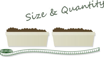 ネットに沿って鉢を配置することから、横長の形状をした鉢を主に用います。あらかじめ緑のカーテンを茂らせる壁面などの幅(=ネットの幅)を測っておいて、その幅に収まるよう、鉢のサイズと数を決めます。各鉢に植える苗の株数は、植物の種類と茂らせる高さによって変わってきます。例えばゴーヤーでは、用土約20Lで1株、約40Lで2株が目安です。