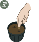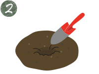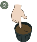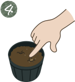 培養土を入れた直径9cmのポリポットに、ゴーヤーの場合は深さ約1.5cmのまき穴を2カ所開ける(鉢底の穴は、タマネギの皮や落ち葉などでふさぐとよい。植物の種類によりまき穴の深さは5mm~1.5cmにする)。