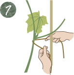 植物を支柱やネットにひもで結び付けることを誘引といいます。緑のカーテンではひもが成長の妨げにならないよう、ひもとつるの間に遊びができるように8の字を描くように結び付けます。なお誘引には麻ひもを用いるほか、便利な専用クリップもあります。